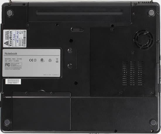 Дно ноутбука (если оставить в покое внешний вид пластмассы) достаточно аскетичное. Два люка, заборная решетка вентиляции (на мягком ноутбук греется), батарея за единственной защелкой. Побывавший у нас экземпляр имеет наклейку easybook.