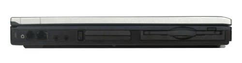 А вот слева достаточно много разъемов. Помимо разъема под замок Кенсингтона, здесь же находятся сетевой и модемный порты (они сдвинуты к самому заднему краю, поэтому идущие от них кабели почти не бросаются в глаза), далее идут аудиоразъемы, два разъема PCMCIA и, наконец, флоппи-дисковод.