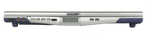 На передней панели находится достаточно много органов управления. Слева направо: ИК-порт, аудиоразъемы (над ними видно края системных индикаторов, которых в этой модели два), дальше идут кнопки встроенного МР3-плеера, колесико регулировки громкости, ЖК-экран этого плеера и еще две кнопки управления. Обратите внимание, что экран сделан на утолщении и развернут не просто вперед, а еще и немного вверх: это позволяет улучшить считывание информации. Расположение ИК-порта и аудиоразъемов на передней панели (да еще и рядом) не лучшее решение, на мой взгляд, пользоваться и тем, и другим будет достаточно неудобно.