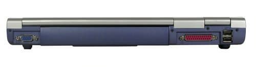 Большую часть пространства задней стенки занимает аккумуляторная батарея, поэтому место осталось только для вывода на внешний монитор, порт LPT, порты USB (к сожалению, они как раз оказались на неудобной для быстрого доступа задней панели). Правда, здесь это практически не мешает: порты расположены очень близко к краю, поэтому можно втыкать устройства наощупь, не заглядывая за матрицу.