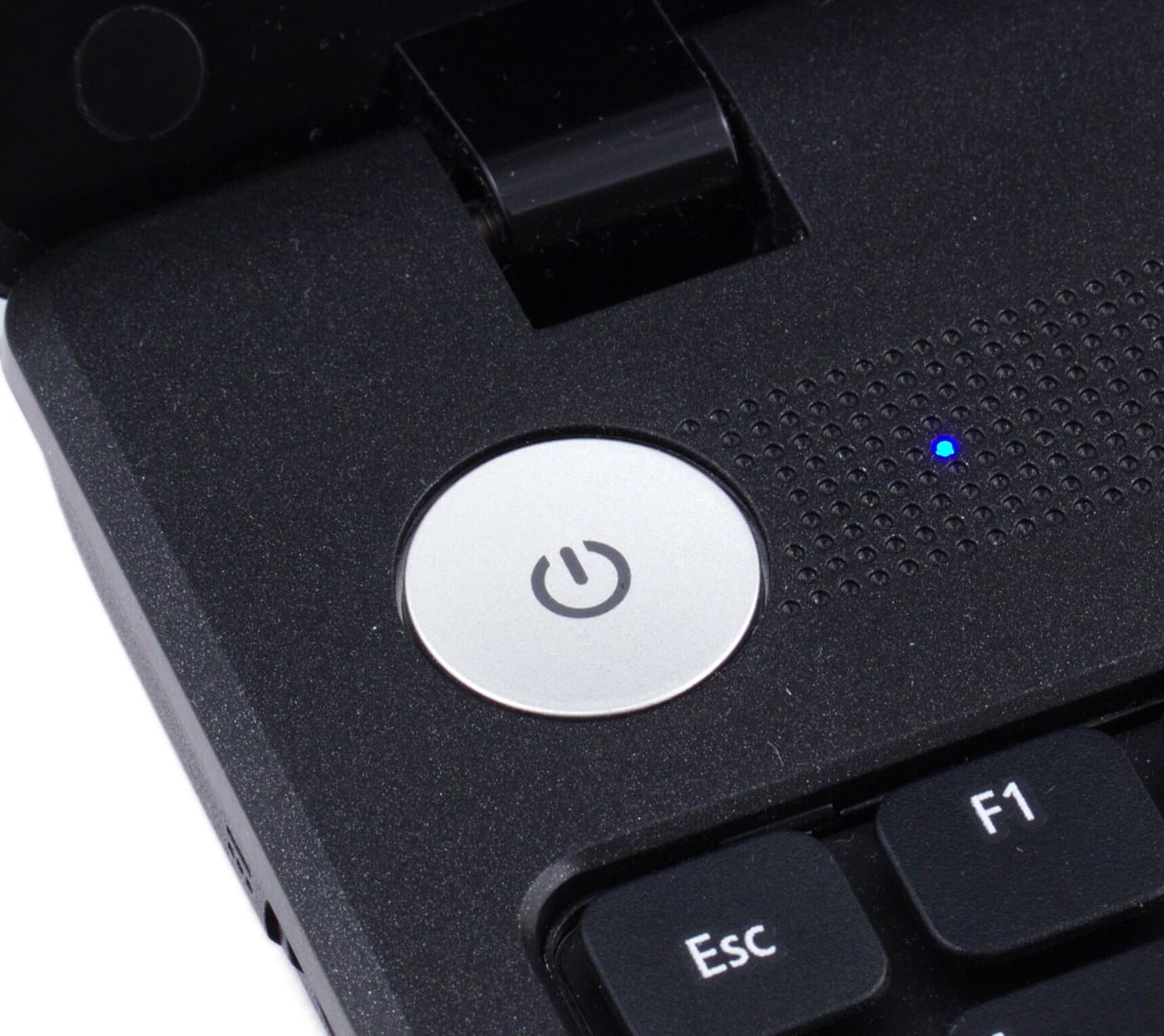 С открытой крышкой ноутбук выглядит вполне по-рабочему, хоть и просто. Сразу обращает на себя внимание внушительная серебристая кнопка запуска системы, кстати, довольно удобная в работе, больше никаких интересных деталей интерьера у ноутбука нет. Он прост, как картонная коробка. Клавиатурная панель тоже сделана с текстурой, только кружочки текстуры здесь мельче. Мне показалось, что ладони на такой рифленой поверхности лежат удобнее, чем просто на гладком пластике. Опять же, хоть он и шероховатый, но ощущения от взаимодействия с ним скорее приятные.