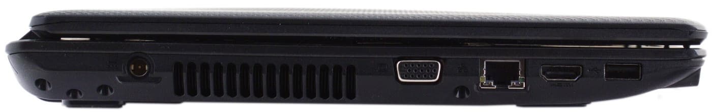 На левой панели, ближе к краю, расположен разъем для штекера питания. Сам штекер угловой, шнур можно легко увести за матрицу. Правда, если приподнимать и двигать ноутбук по столу, то провод тут же попадает под него, но это недостаток почти всех ноутбуков с такой конструкцией. Вставлять и вытаскивать штекер удобно. Далее идет большая решетка вентиляции, выход VGA, сетевой разъем, выход HDMI и порт USB. Все выходы расположены близко к передней грани, иногда это мешает в работе.