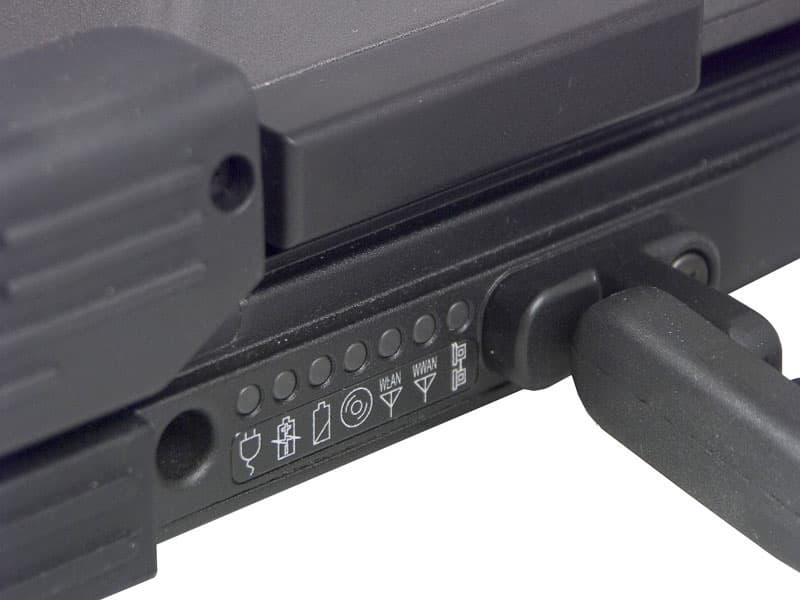 На переднем торце — индикаторы работы от сети, батарей, зарядки батареи, активности беспроводной и проводной сети и беспроводного модема (в случае его наличия) и устройства работы с оптическими дисками.
