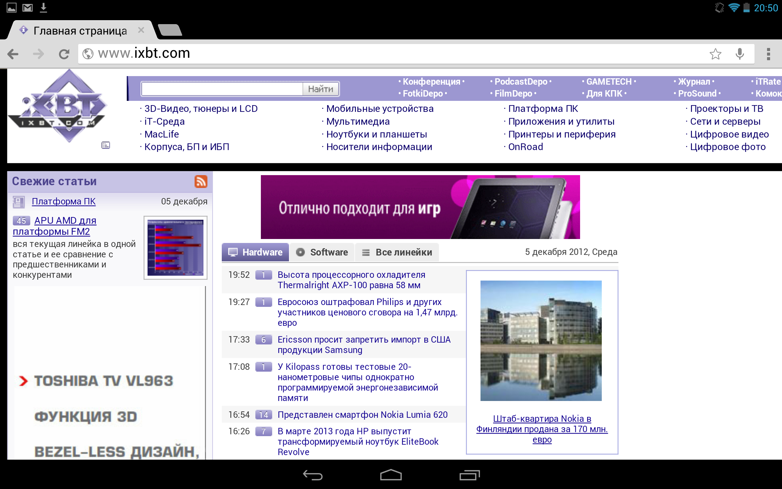Что ж, у iPad с Retina-дисплеем появился очень серьезный конкурент за звание лучшего планшета 2012 года. Причем, что интересно, Google обыгрывает Apple на территории последней: разрешение экрана, производительность SoC (при двухъядерном CPU), возможность играть в самые современные 3D-игры. По иронии судьбы (а скорее, по сознательному намерению производителей), недостатки у Nexus 10 те же: невозможность подключить внешний накопитель и расширить память за счет флэш-карт, скудная комплектация. Но, пожалуй, этим недостатки Nexus 10 и ограничиваются. А к достоинствам, по сравнению с iPad, следует отнести более низкую стоимость, возможность подключения внешнего экрана по HDMI и все-таки бо́льшую открытость операционной системы Android (которая здесь в новейшей версии — Android 4.2 Jelly Bean). Еще бы полноценную клавиатуру-док этому планшету (как у Transformer) — и цены бы ему не было.