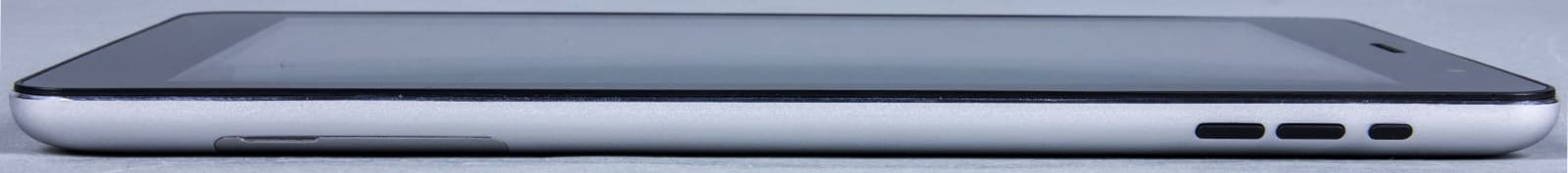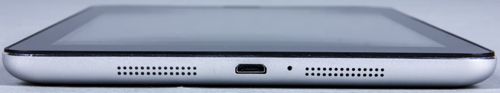 Внизу, как и предполагалось, размещены стереодинамики средней громкости, порт Micro-USB и микрофон. Качество сборки планшета можно охарактеризовать как посредственное. Помимо недостатков в отдельных элементах, отмеченных выше, сам unibody-корпус слегка поскрипывает..