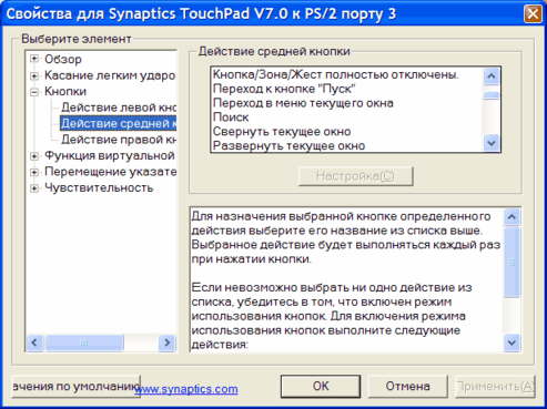 Клик-кнопки можно гибко переназначить через драйвер вплоть до запуска произвольных программ или комбинации клавиш. Оба блока кнопок связаны, т.е. изменения действуют одновременно для обоих групп, настроить их на разные действия не получится. Возможно это конструктивное ограничение Synaptics (порт ps/2), но в будущих моделях ноутбуков хотелось бы видеть раздельное управление и наличие профилей для разных программ.