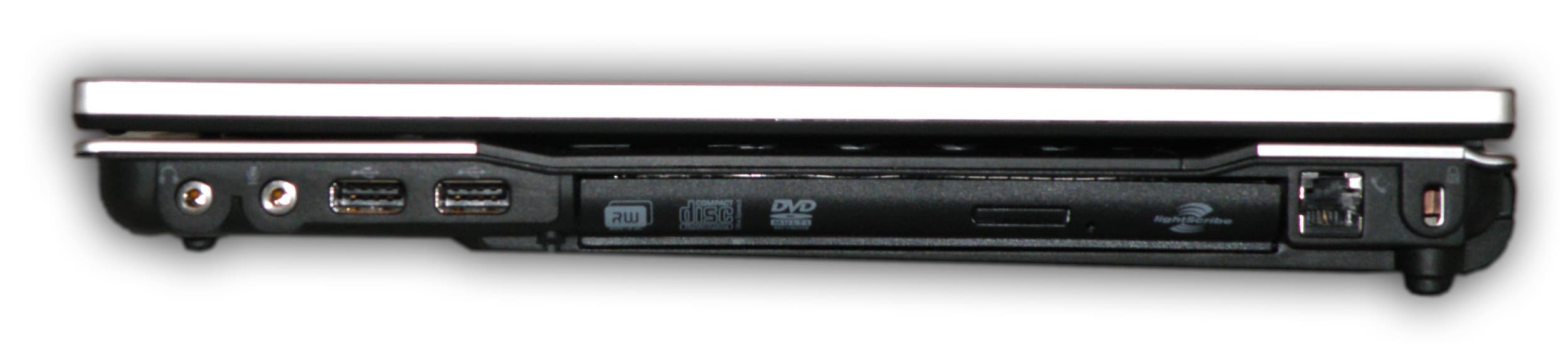 На правой грани находятся порт замка Кенсингтона, телефонная розетка для факс-модема, пишущий привод DVD с поддержкой LightScribe в отсеке расширения (в этот отсек возможна установка других устройств, например, жестких дисков в специальном переходнике), 2 порта USB 2.0, микрофонный вход и выход для наушников. О последнем стоит поговорить отдельно.