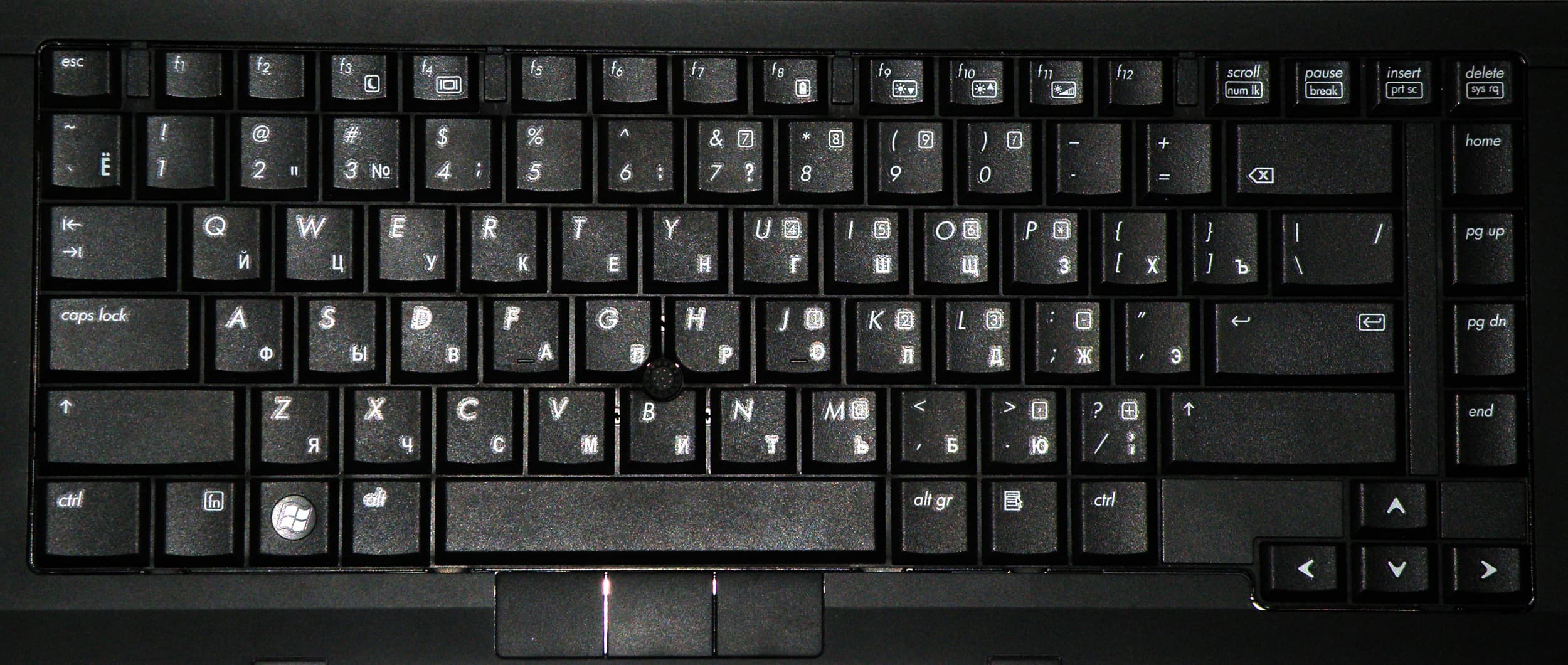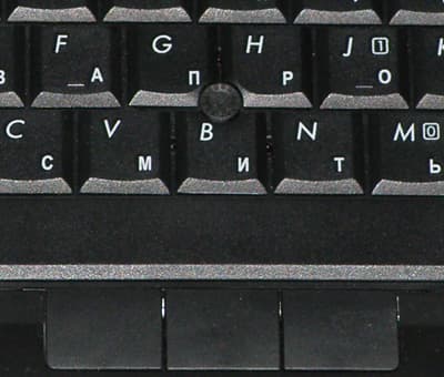 Между буквами G-H-B расположен джойстик-поинтстик Synaptics черного цвета, который имеет вогнутую форму, наощупь не очень приятный, отстроить и приноровиться к нему не получилось слишком дерганый. Кроме того, поначалу он мешает при печати, так как представляет собой «инородный» объект и отъедает немного площади у клавиш. Шляпка съемная и может быть заменена на любую подходящую.