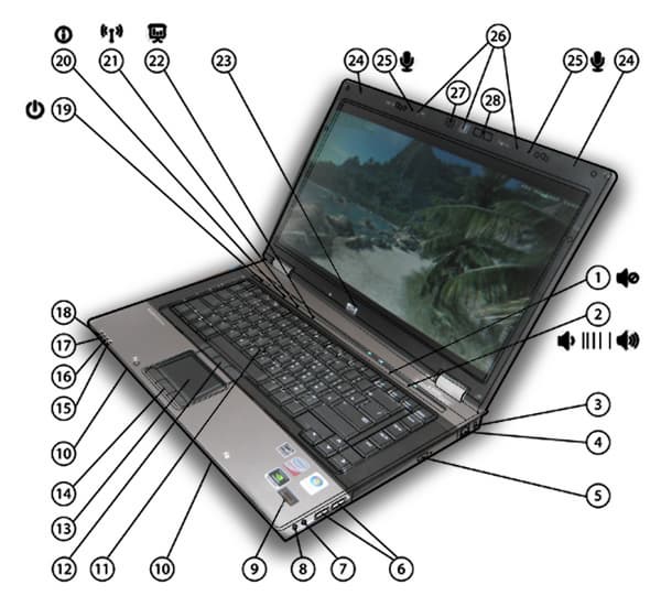 1. | Volume mute button with LED indicator | 15. | Hard drive / optical drive activity / HP 3D DriveGuard LED |