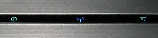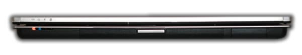 На фронтальной панели находится: кнопка открытия крышки, пара динамиков, 4 индикаторных светодиода Wireless on/off, Power/standby, Battery charging, Hard drive / optical drive activity.