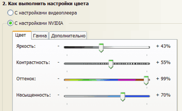 При стандартных настройках видео выглядит несколько блеклым и ненатуральным, приходится увеличивать насыщенность и чуть-чуть крутить цветовую палитру (для «усинения»), кроме того, можно включить подчеркивание контуров и подавление помех для видео форматов ниже HD: