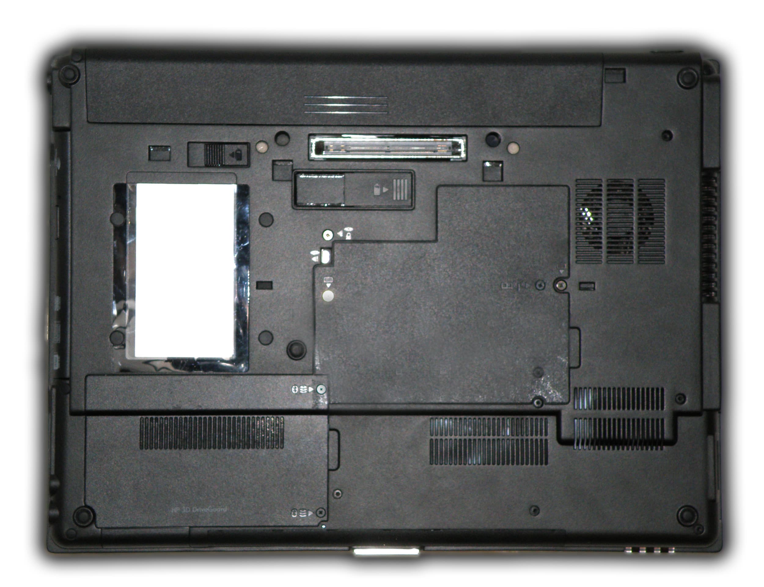 Доступ к памяти и жесткому диску свободный, вентиляционных отверстий немного, так что нижняя часть не представляет какого либо интереса, разве что стоит обратить внимание на карманчик, в который вставляется карточка с данными владельца.