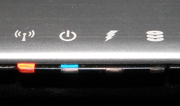 Блок индикации состояния ноутбука на торцевой грани также выполнен в двух цветах (иконки WLAN/Power продублированы). Значок питания (молния) горит красно-рыжим во время зарядки, после 95% бирюзовым и при полной зарядке не горит вовсе.