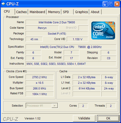 Возникли разногласия в множителе, так как для T9600 действует x10.5, а для более быстрого T9800 x11. Странно, но на мгновение в Everest множитель может опускаться до x10.5 и очень редко в CPU-Z подниматься до x11. В простое множитель сбрасывается до x6 ~ 1600 MHz.
