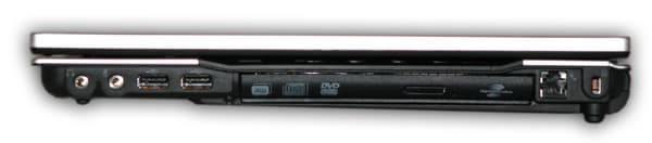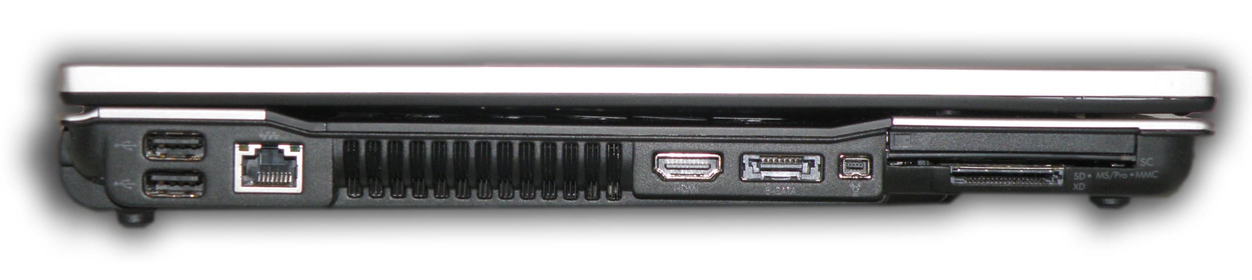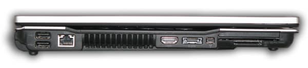 На левой грани располагается 2 порта USB 2.0, RJ-45/Ethernet, выходное отверстие вентиляции, HDMI, eSATA, IEEE1394 (4pin iLink), картовод, а над ним расположен cлот ExpressCard, закрытый шторкой.
