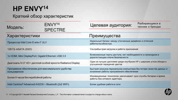 Как видите, компания Hewlett-Packard пошла по той же дорожке, что и многие другие производители: модели в одном и том же корпусе используют либо платформу Intel, тогда это ультрабуки, либо какую-нибудь другую… тогда это сликбуки. Но внешний вид и большинство параметров корпуса у них идентичны.