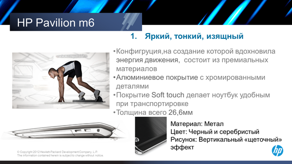 Подобный слайд показывали еще в Шанхае, когда иллюстрировали новый подход Hewlett-Packard к дизайну. Рассуждения и аналогии про спортсменов на старте мне показались малоактуальными, тем более что на этот ноутбук никто не будет смотреть из такого положения. Тем не менее, внешне М6 произвел на меня очень приятное впечатление.