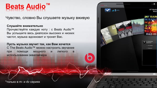 Эта технология — плод сотрудничества НР и относительно молодой, но уже завоевавшей себе имя на рынке компании Beats Audio. Можно отметить, что по похожему пути пошли сейчас практически все производители ноутбуков и в результате имеют на старших моделях «брендированную» акустику, обеспечивающую уже более-менее вменяемое качество звука даже при тех ограничениях (первым делом для динамиков), которые там существуют.