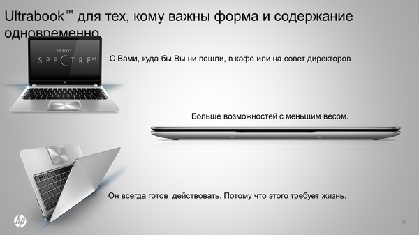 Однако компания относится к ультрабукам достаточно утилитарно. Hewlett-Packard производит очень много самых разных ноутбуков. Поэтому к ультрабукам она относится как к одному из их классов, со своими плюсами (включая поддержку Intel) и со своими минусами. Они хороши для некоторых рынков и целевых ниш. Если какая-то модель подходит под концепцию ультрабука и удовлетворяет требованиям Intel, то компания с удовольствием относит ее к этой категории. Для тонких и легких моделей, не попадающих в категорию ультрабуков, у Hewlett-Packard есть собственная категория устройств Sleekbook. Сюда относятся, например, тонкие ноутбуки на платформе AMD. Наконец, многие модели не попадают в категорию из-за несоблюдения каких-то требований Intel. Но и тут нет ничего страшного: и такие ноутбуки весьма востребованы рынком.