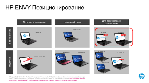 Сейчас линейка Envy является просто одной из домашних линеек Hewlett-Packard. Судя по всему, пока она позиционируется чуть выше, чем обычные домашние Pavilion, но в ней уже появились дешевые модели. В частности, на презентации все модели были либо на младших Intel Core i3 (который, кстати говоря, пока еще остался второго поколения Sandy Bridge), и даже Sleekbook на платформе AMD.