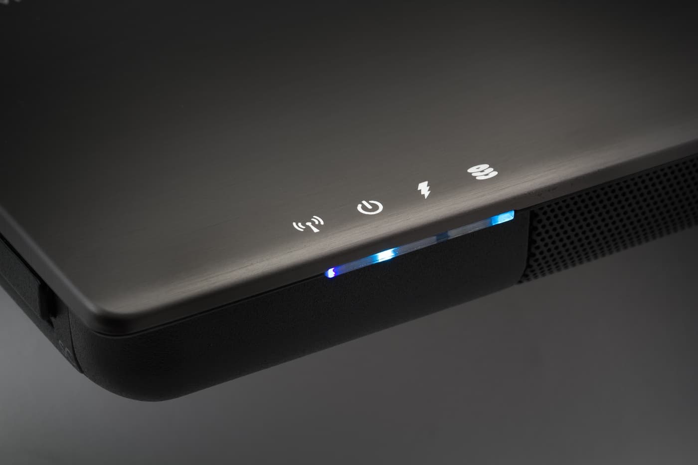 Всего индикаторов четыре: индикатор беспроводной сети (горит голубым, когда беспроводные интерфейсы активированы и оранжевым — когда отключены), индикатор работы ноутбука (горит голубым при работе, мигает — в спящем режиме), индикатор состояния батареи (к сожалению, когда батарея заряжена или работа идет от батареи — не горит, поэтому индикация перехода на батарею неудовлетворительна), индикатор обращения к жесткому диску. Если смотреть прямо на индикаторы, они довольно яркие.