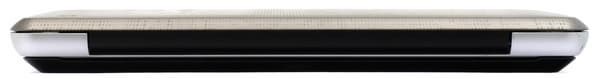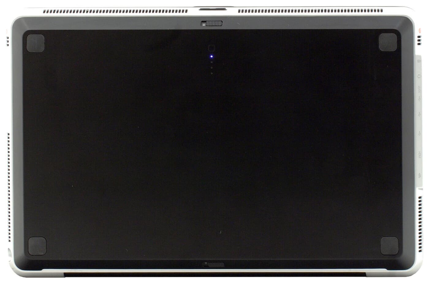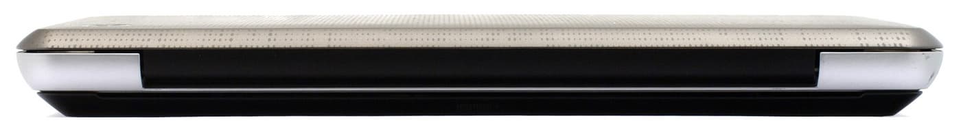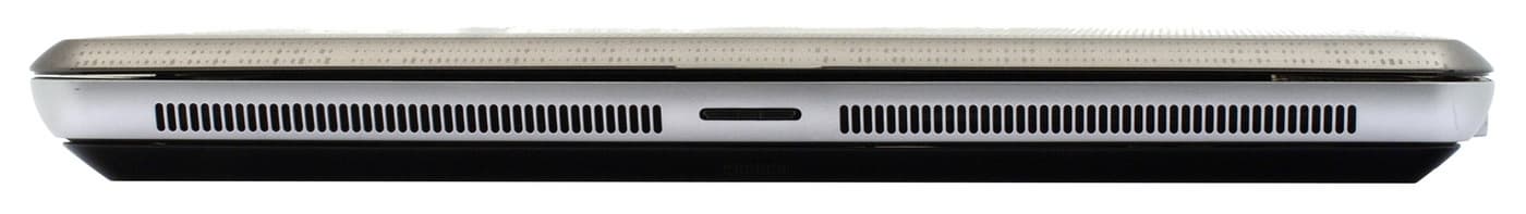 На передней панели только картовод (пока дело не дошло до работы, я думал, что это кнопка открывания крышки) и две большие решетки для вентиляции. Вообще, учитывая, что низ корпуса целиком занят батареей, вся вентиляция должна осуществляться через боковые грани ноутбука.
