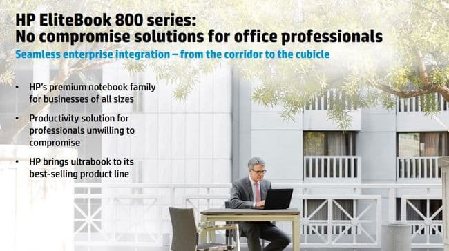 НР ориентирует ноутбуки Elitebook 800 на руководящих работников и сотрудников высшего и среднего звена, которые постоянно работают с ноутбуком и часто перемещаются — поэтому для них улучшение массогабаритных показателей будет существенным. Кстати, с дополнительной батареей Elitebook могут обеспечить до 33 часов автономной работы.