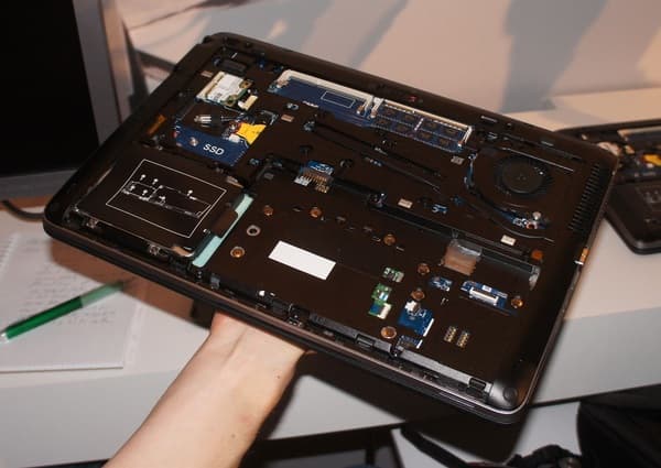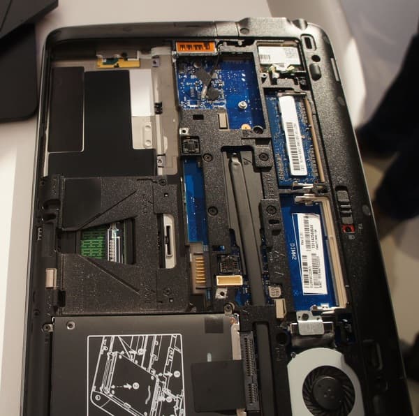 Итак, что стоит отметить. Новые Elitebook перешли в разряд ультрабуков, а в тонком корпусе не разместишь большую систему охлаждения. Поэтому пришлось переходить на ультрамобильные процессоры Intel, но производительности текущего поколения должно вполне хватать для любых офисных задач. В большинстве представленных на американском сайте моделей стоит Intel Core i5-4200U. Судя по спецификациям, все процессоры будут иметь HD Graphics 4400. Кстати, вот так выглядит ноутбук со снятой нижней крышкой.