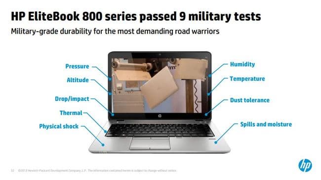 Прочность и надежность корпуса по-прежнему на очень высоком уровне. У Elitebook магниевое шасси (почему-то написано unibody), усиленное алюминиевыми вставками. 800-ая серия проходит военные тесты MIL-STD810G как на прочность корпуса, так и на сопротивляемость попаданию влаги и пыли. В частности, можно не опасаться легких ударов и падений (хотя сложно определить, что производитель имеет ввиду под «легкими») и пролитой в небольших количествах жидкости. И при этом сохраняется возможность легкого доступа внутрь корпуса для обслуживания и модернизации.