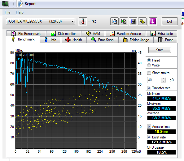 Забавно, что в ноутбуке Toshiba был использован винчестер от Hitachi, тогда как в HP стоял диск Toshiba, который продемонстрировал чуть более привлекательные результаты. Хотя средний уровень в обоих случаях соответствует показателям, характерным для современных дисков с частотой вращения 5400 об./мин.