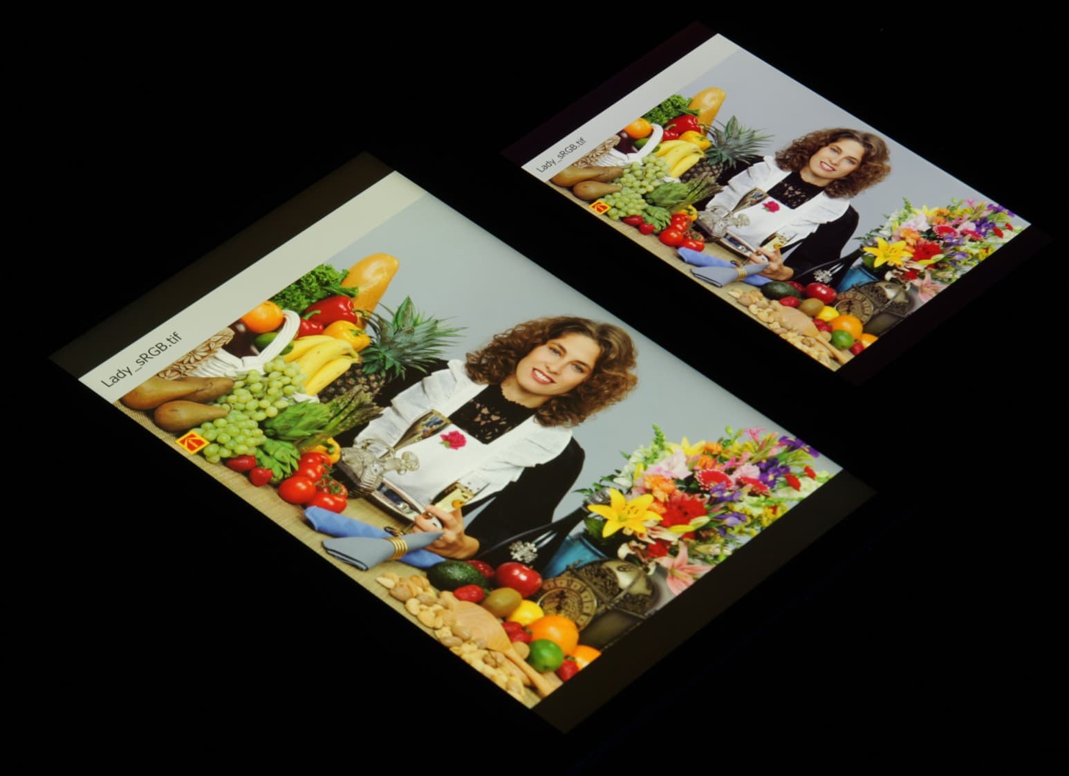 Экран имеет хорошие углы обзора без инвертирования оттенков и без значительного сдвига цветов даже при больших отклонениях взгляда от перпендикуляра к экрану. Для сравнения приведем фотографии, на которых на экраны Nexus 7 и тестируемого планшета выведены одинаковые изображения, при этом яркость обоих экранов установлена примерно на 200 кд/м², а цветовой баланс на фотоаппарате принудительно переключен на 6500 К. Перпендикулярно к экранам тестовая картинка: