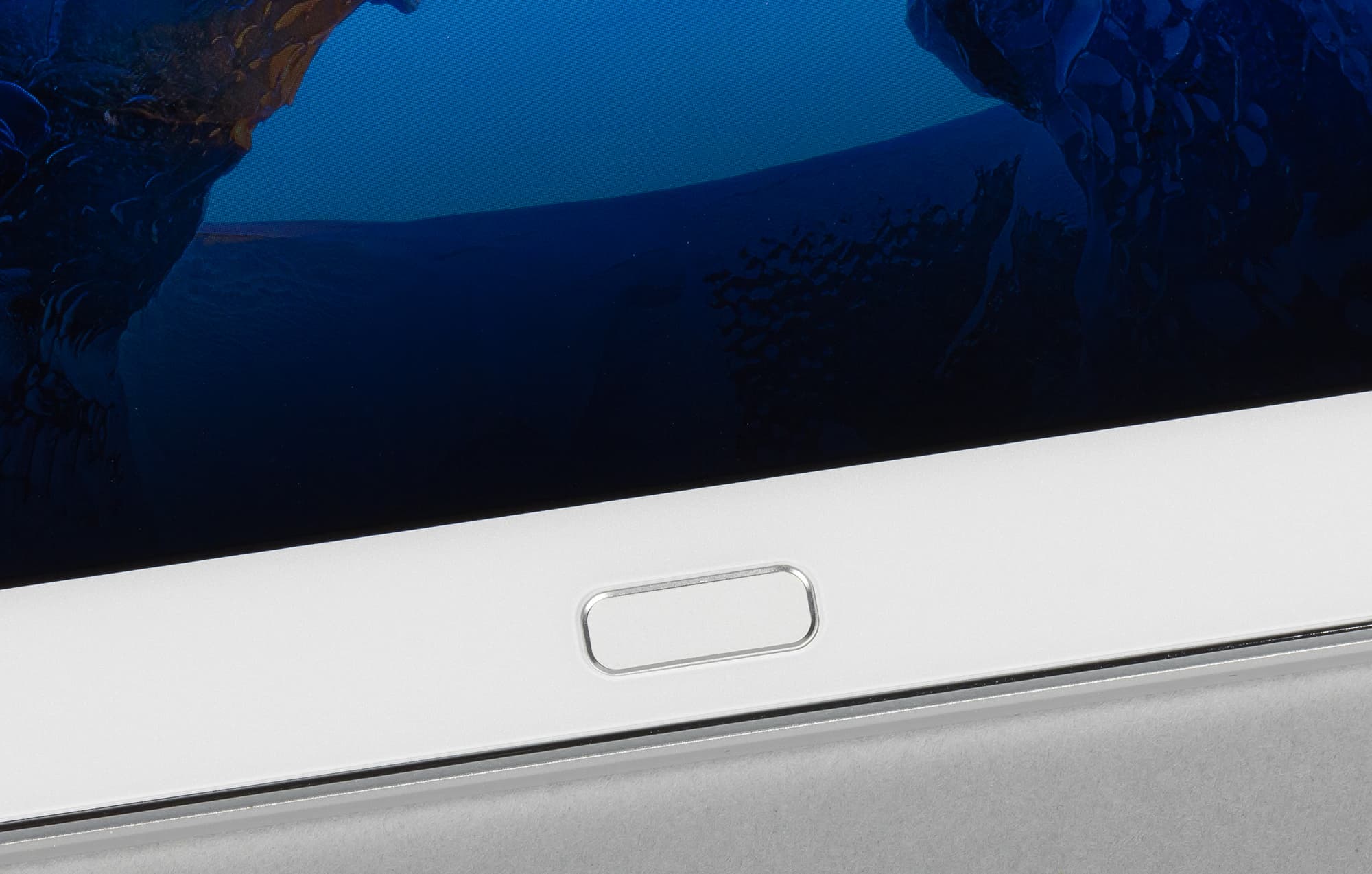 В глаза бросается небольшое овальное углубление под экраном — по форме оно недвусмысленно напоминает кнопку «Домой» на мобильных устройствах Samsung. Это действительно кнопка, но сенсорная, а не физическая. А еще — сканер отпечатков пальцев.