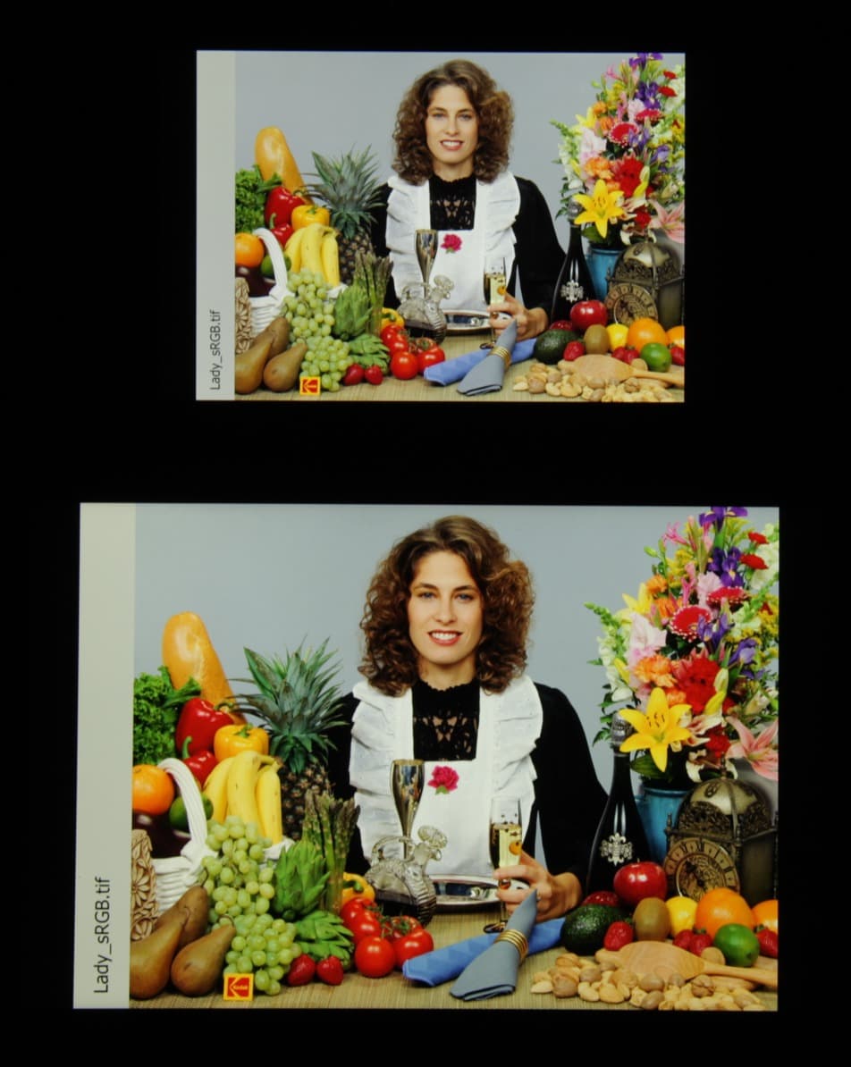 В итоге цвета имеют естественную насыщенность. Баланс оттенков на шкале серого немного компромиссный, так как цветовая температура несильно выше стандартных 6500 К, но отклонение от спектра абсолютно черного тела (ΔE) для большинства оттенков серого выше 10, что даже для потребительского устройства считается не очень хорошим показателем. Хорошо, что при этом вариация цветовой температуры и ΔE небольшая, что положительно сказывается на визуальном восприятии цветового баланса. (Темные области шкалы серого можно не учитывать, так как там баланс цветов не имеет большого значения, да и погрешность измерений цветовых характеристик на низкой яркости большая.)