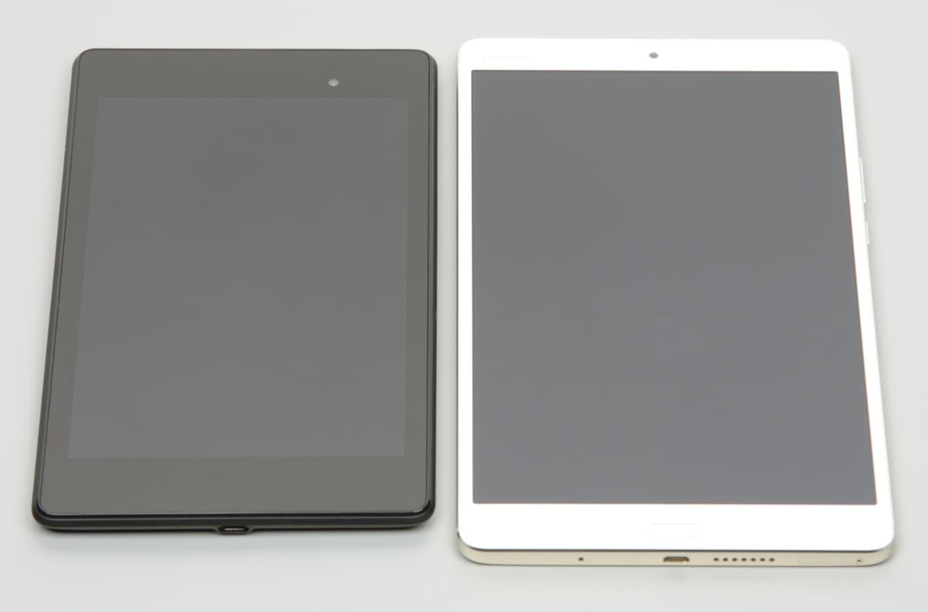 Лицевая поверхность экрана выполнена в виде стеклянной пластины с зеркально-гладкой поверхностью, устойчивой к появлению царапин. Судя по яркости отраженных объектов, антибликовые свойства экрана может чуть хуже, чем у Google Nexus 7 (2013) (далее просто Nexus 7). Для наглядности приведем фотографию, на которой в выключенных экранах обоих планшетов отражается белая поверхность (Huawei MediaPad M3 — справа, далее их можно различать по размеру):
