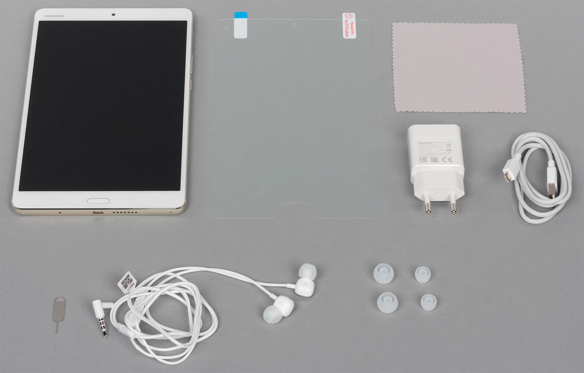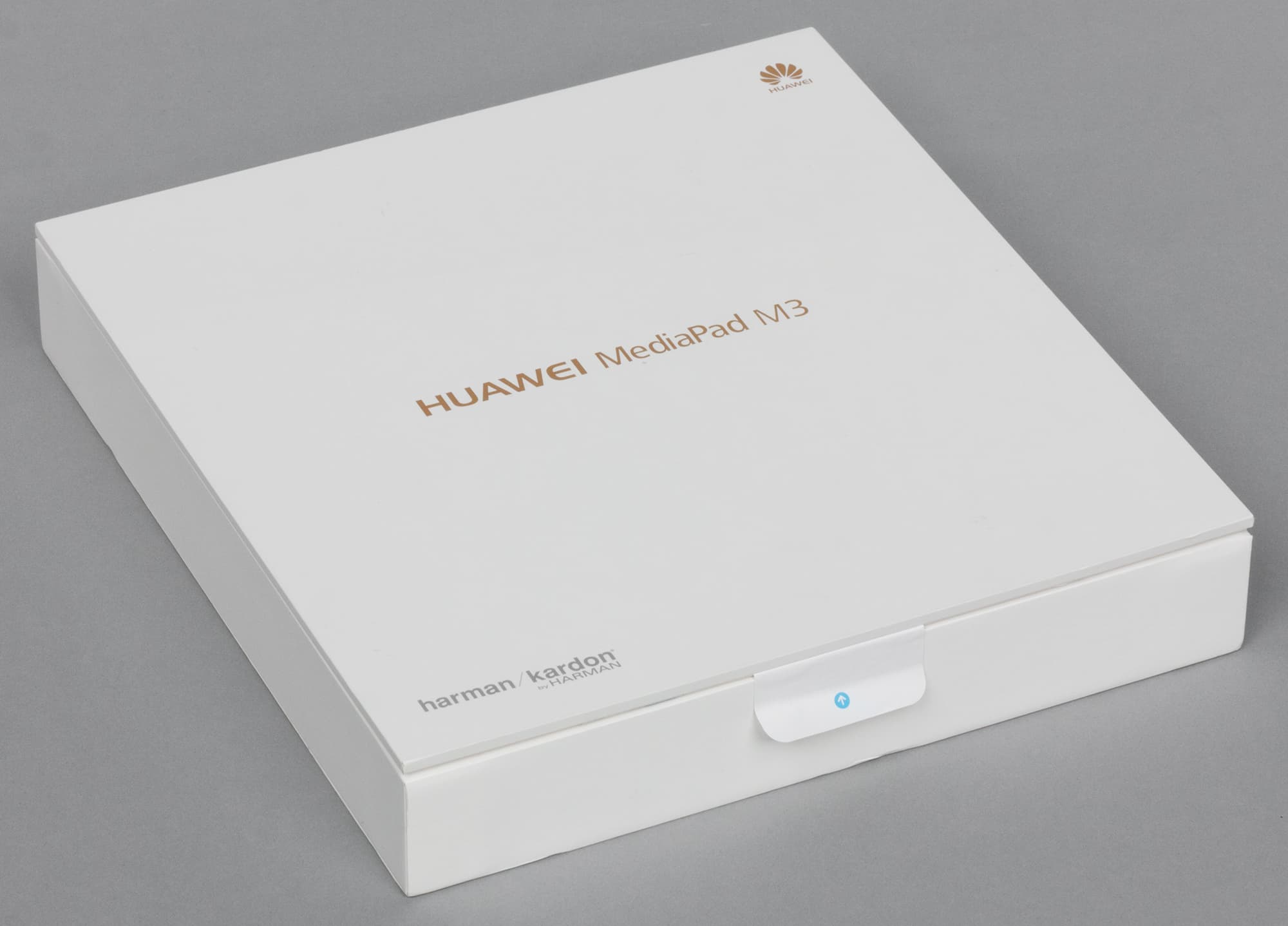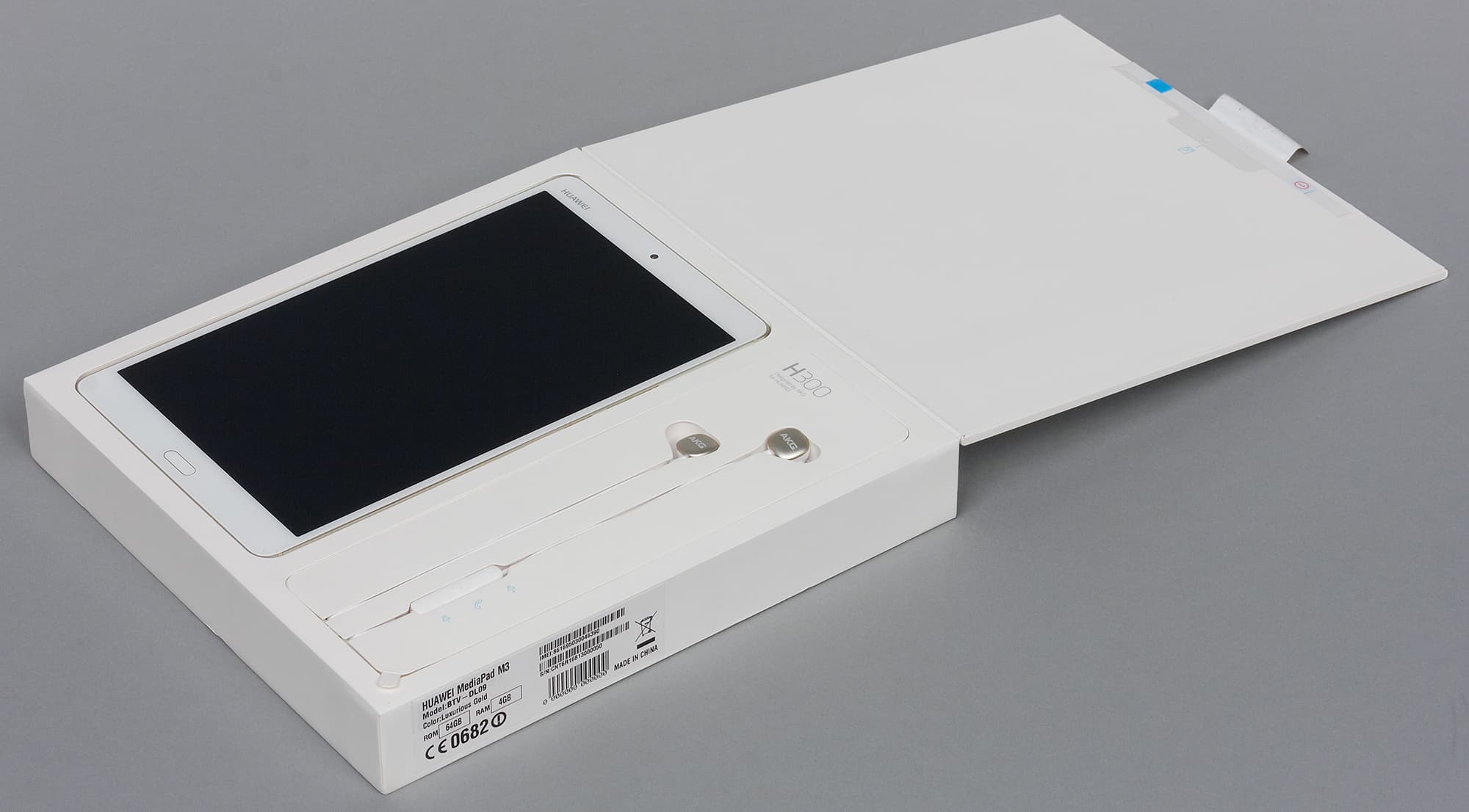 Huawei MediaPad M3 имеет несколько различных вариантов комплектации, в том числе и «люксовую», дополненную качественными наушниками AKG H300. В нашем случае такая модель называется Luxurious Gold, BTV-DL09. Аппарат поступает в продажу в плоской крупной коробке квадратной формы из белого матового картона.