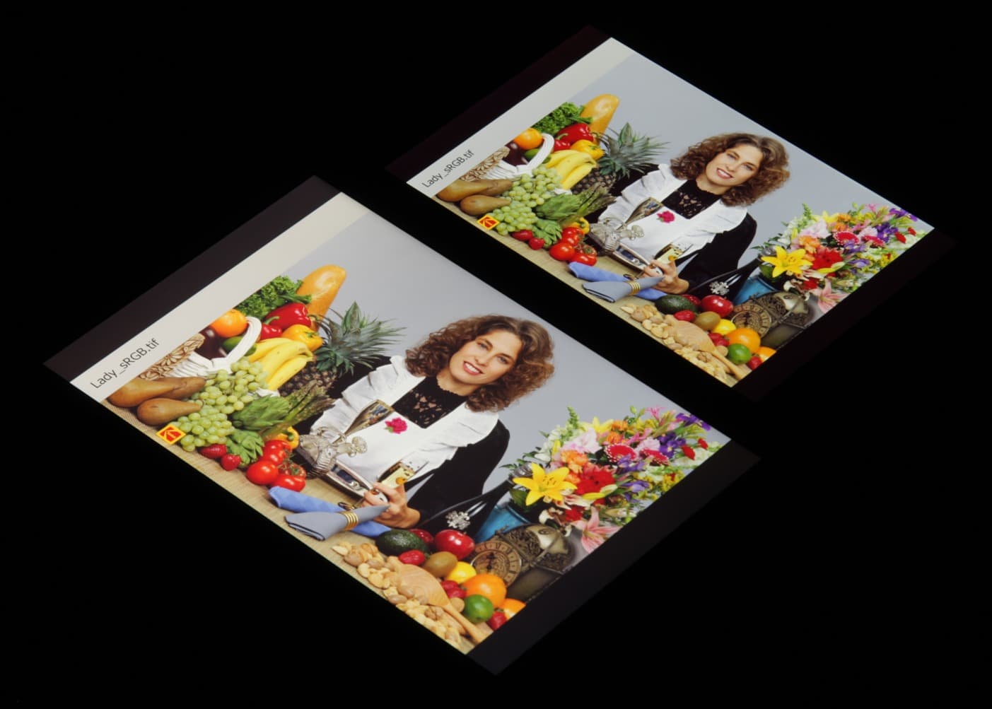 Экран имеет хорошие углы обзора без инвертирования оттенков и без значительного сдвига цветов даже при больших отклонениях взгляда от перпендикуляра к экрану. Для сравнения приведем фотографии, на которых на экраны Nexus 7 и тестируемого планшета выведены одинаковые изображения, при этом яркость обоих экранов установлена примерно на 200 кд/м², а цветовой баланс на фотоаппарате принудительно переключен на 6500 К.