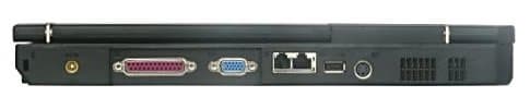 Слева направо идут: разъем для замка Кенсингтона, разъем питания, порт LPT, выход на внешний монитор, сгруппированные модемный и сетевой разъемы, еще один порт USB 2.0, ТВ-выход S-Video и еще одна решетка системы вентиляции.
