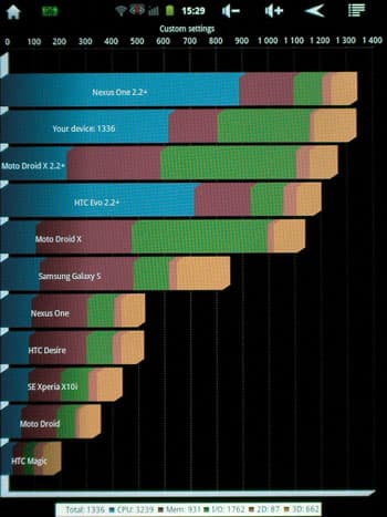Для фиксации результатов теста Quadrant придётся вновь доставать фотоаппарат. Наш планшет, как видно на фотографии, мирно пристроился на втором месте в списке, сразу после смартфона Nexus One 2.2.