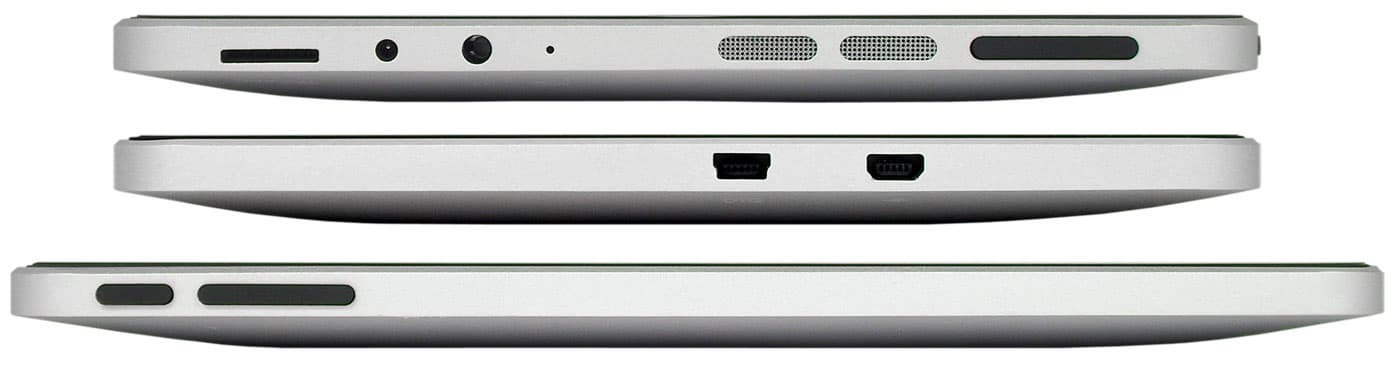 Профиль планшета напоминает профиль… Впрочем, читатель наверняка понял, о профиле какого устройства речь. Ниже имеются фотографии боковых граней планшета: правой, левой и верхней. На них расположены следующие порты и органы управления:
