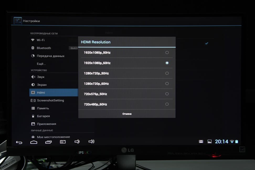 Как уже было сказано, планшет оснащен выходом Mini-HDMI. Для тестирования интерфейса HDMI мы использовали монитор LG IPS237L и простой кабель-переходник с разъема Mini-HDMI на обычный HDMI. Режим вывода можно выбрать в меню установок: