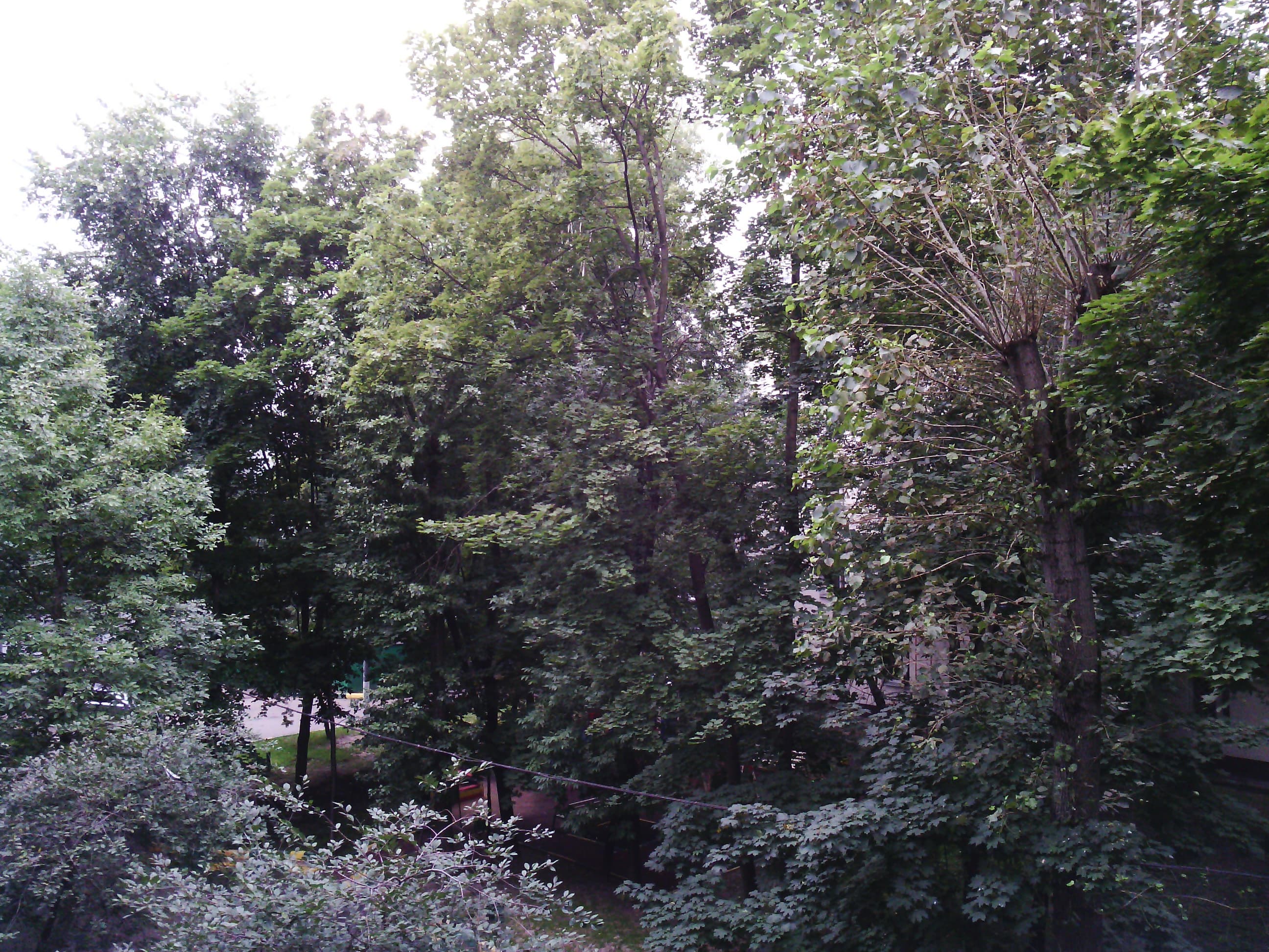 Качество фотографий с тыловой камеры среднее. Страдает цветопередача (картинка слишком темная, оттенки неестественные) и четкость, листья деревьев довольно сильно размыты, многовато артефактов. Вот фрагмент снимка из окна здания днем: