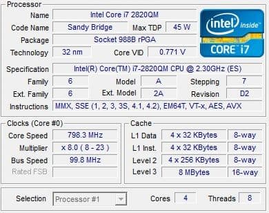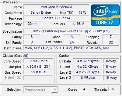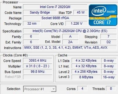 Архитектура у обоих процессоров одинаковая, оба процессора имеют четыре ядра и поддерживают технологию Hyperthreading, общее число потоков — восемь. А вот номинальная частота у 2630QM составляет 2 ГГц, у 2820QM — 2,3 ГГц. Максимальная частота в Turbo Boost — 2,9 и 3,4 ГГц соответственно. Кроме того, у 2820QM больше кэш — 8 МБ против 6 МБ у 2630QM.
