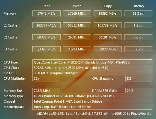 В этом синтетическом тесте (он еще и очень короткий, секунд пять) 2820QM показывает существенно более высокие результаты по работе с памятью и кэшами всех уровней, а также меньшую латентность памяти. Что, впрочем, неудивительно: он работает с более быстрой памятью и на значительно более высокой частоте, 3,3 ГГц против 2,6 ГГц у 2630QM. Как видите, разница в частотах при работающем Turbo Boost очень большая и, кстати говоря, в процентном отношении больше, чем между номинальными частотами. Тест указывает на разгон на 30 и 43% от номинальных значений соответственно.