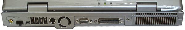 На заднем торце достаточно много места отведено вентиляционным решеткам системы охлаждения процессора и графического контроллера. На оставшемся пространстве находятся (слева направо):