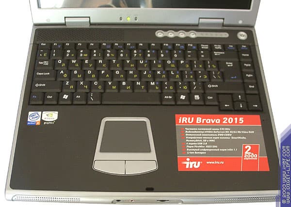 Подводя итог, могу сказать, что ноутбук iRU Brava 2015 будет хорошо смотреться на вашем рабочем столе. Замечаний не так много не самая мощная на сегодняшний день видеокарта Nvidia GeForce4 MX440 Go, отсутствие клавиш скроллинга у тачпэда и не очень удачное расположение разъемов. При этом цена ноутбука в той комплектации, которая побывала на тесте $2410.