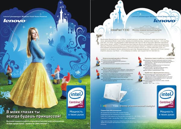 Первый плод совместной работы двух компаний, Mickey Limited Edition, был представлен широкой публике в 2005 году на мероприятии в гонконгском Диснейленде. Второй ноутбук, Winnie Limited Edition, анонсировали в 2006 году — в год 80-летия образа Вини Пуха. Третья модель с изображением Микки Мауса на корпусе появилась в 2007 году. А теперь вот Lenovo анонсирует в России IdeaPad Y330 Disney Princess Limited Edition, который, по идее маркетологов Lenovo, ориентирован прежде всего на девочек и девушек, желающих почувствовать себя принцессами :-)
