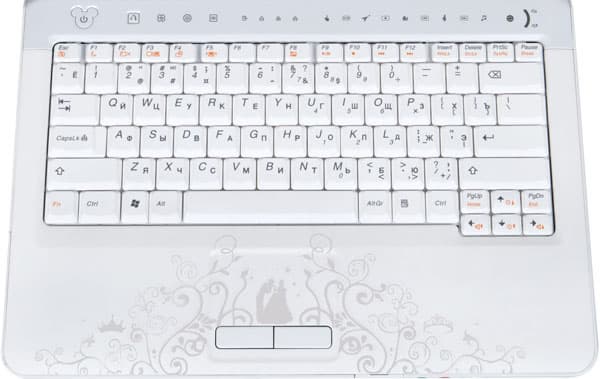 И здесь, конечно, сразу бросается в глаза оформление крышки ноутбука. Прихотливый узор, складывающийся в изображение замка Золушки, отлично смотрится на мягком жемчужном фоне. Диснеевская тема затронута и в оформлении клавиатуры и области тачпада. Так, клавиша включения / выключения ноутбука выполнена в форме головы Микки Мауса, а над кнопками мыши мы видим принца и прицессу.