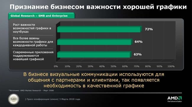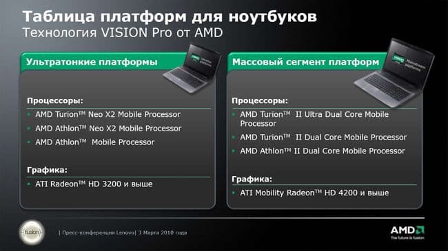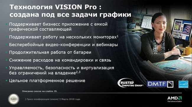 В представленных ноутбуках Lenovo используется платформа Vision Pro (о самой платформе мы поговорим ниже). В представлении платформы компания AMD почему-то сосредоточилась именно на графической подсистеме, на выводе визуальной информации на экран. Я, конечно, понимаю, что название Vision (дословно переводится как «видение», «взгляд») обязывает, но тем не менее. На мой взгляд, логическая цепочка «человек лучше воспринимает информацию глазами, чем другими органами чувств, следовательно, крайне важны возможности графики в компьютере» неверна. Сделайте диаграмму трехмерной, задействуйте кучу трехмерных эффектов и запоминаемость возрастет незначительно (ну, кроме пресловутого Wow-фактора). Гораздо полезнее грамотно сформировать текст презентации.