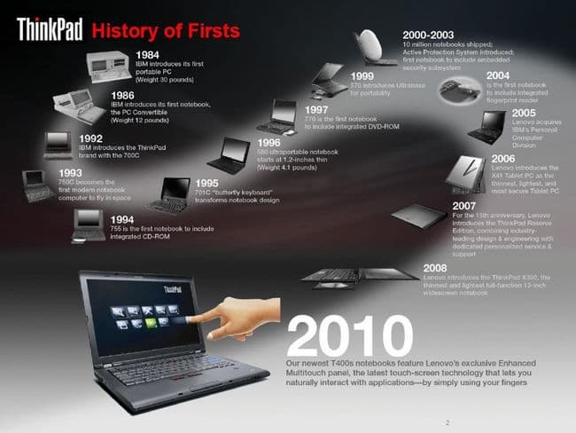 На этом слайде показаны многочисленные этапы творческого пути совершенствования линейки каждый из них знаменует собой внедрение новой для рынка уникальной технологии. И, как видим, таких технологий было немало. Последний шаг новый T400s с чувствительным к касанию экраном. Вот как раз хороший пример. С одной стороны, тачскрины на рынке существуют очень давно, китайские разработчики время от времени пытались их ставить в самые различные модели, а крупные мировые производители упорно их игнорировали. Долгое время технология «не шла», оставаясь нишевой и интересной лишь небольшому кругу энтузиастов. Сейчас, когда за ее продвижение взялась и Microsoft, многие производители стали обращать на нее большое внимание: все чаще 12-дюймовые модели приобретают функциональность планшетов, большая часть решений избавились от радикального недостатка Wacom возможности работать только со стилусом, и учатся работать и с пальцем пользователя. Свою лепту вносят появляющиеся у всех производителей моноблоки. Так что технология не нова. Однако по функциональным особенностям именно эта модель Lenovo уникальна для рынка. Лично мне ThinkPad T400s с тачскрином очень интересен, хотелось бы иметь его следующим ноутбуком.