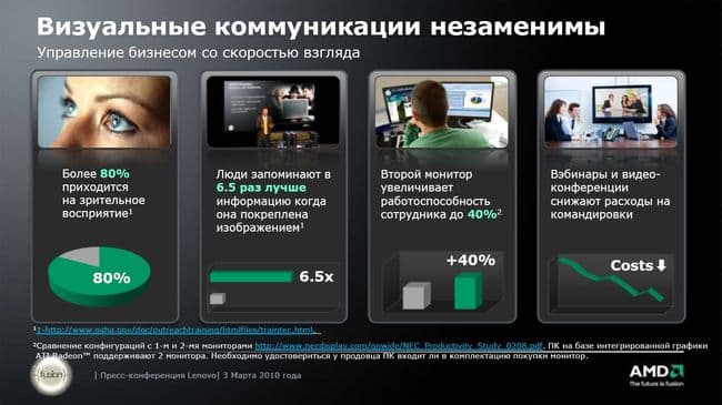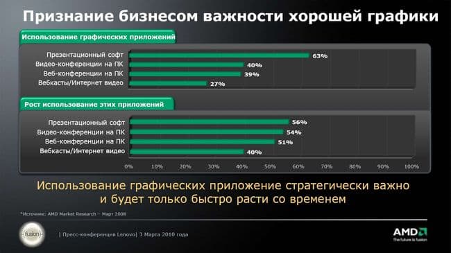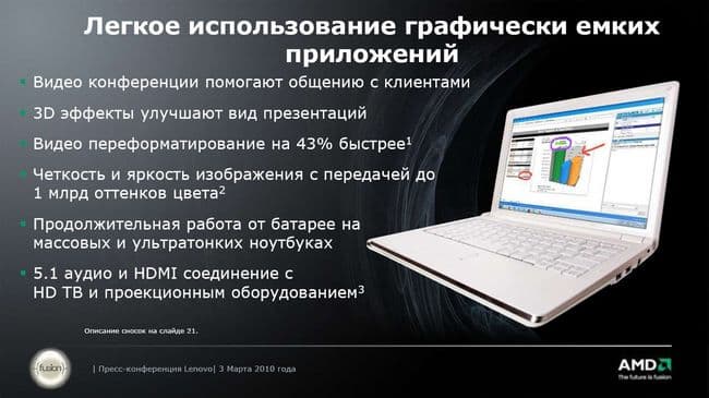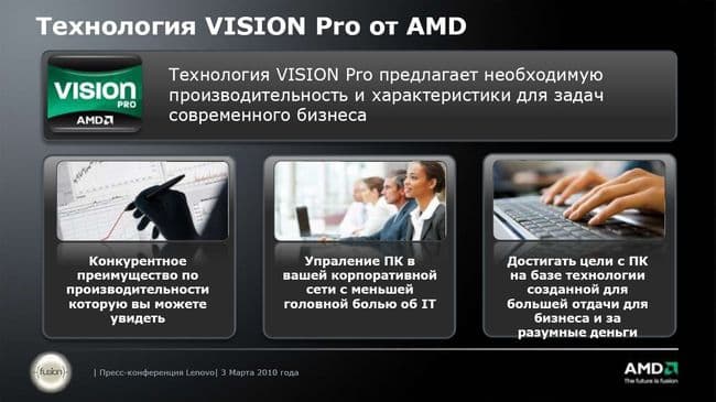 Далее выступал представитель AMD компании, столь внезапно проникшей в сердце корпоративного сегмента Think. Собственно, эта часть презентации началась с двух видеообращений представителей компании AMD. Так как выступления носили очень общий характер, думаю, приводить их в этом материале нет необходимости. Посмотрим на текст презентации, чтобы понять: что платформа AMD в составе новых решений ThinkPad сможет предложить покупателям.